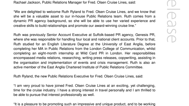 “We are delighted to welcome Ruth Ryland to Fred. Olsen Cruise Lines, and we know that she will be a valuable asset to our in-house Public Relations team. Ruth comes from a dynamic PR agency background, so she will be able to use her varied experience and creative skills to build relationships and promote our award-winning cruise line.”