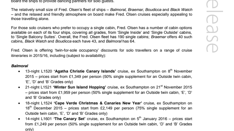 Fred. Olsen is offering ‘twin-for-sole occupancy’ discounts for solo travellers on a range of cruise itineraries in 2015/16, including (subject to availability):
