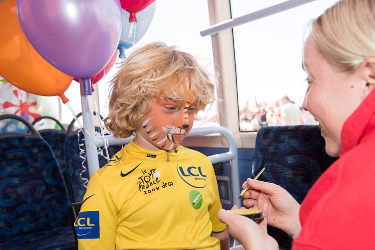 A local youngster at Northern Pride has his face painted on Go North East's Quaylink bus