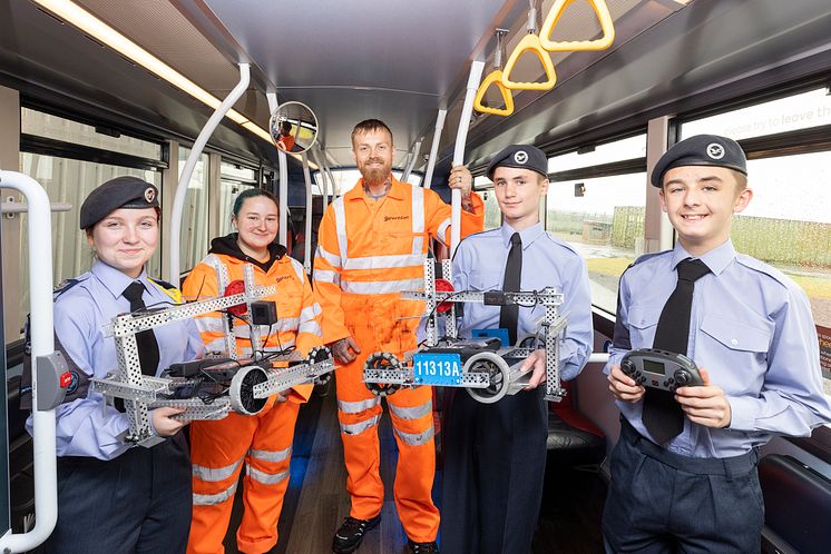 Royal Air Force cadets showing off their robots to Go North East engineers. From left: Summer Wigglesworth, Chloe, Dan Wynne, Ben Tyrrell and Charlie Rowe.