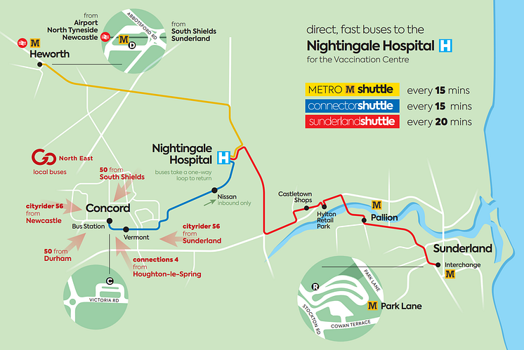 We have three vaccination centre shuttle buses operating to Nightingale Hospital vaccination centre in Washington, providing great connections with local buses and the Tyne & Wear Metro.