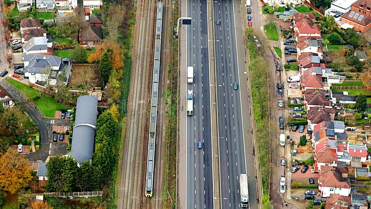Aerial view of the Midland main line beside the M1 - Credit_ Network Rail Air Operations