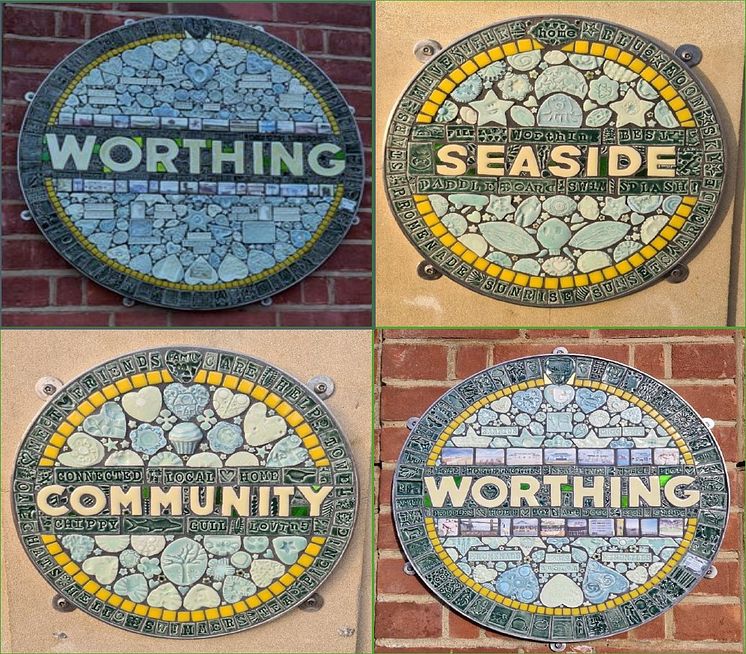 All four ArtyFace roundels at Worthing station - Dubbed Worthing, Seaside, and Community