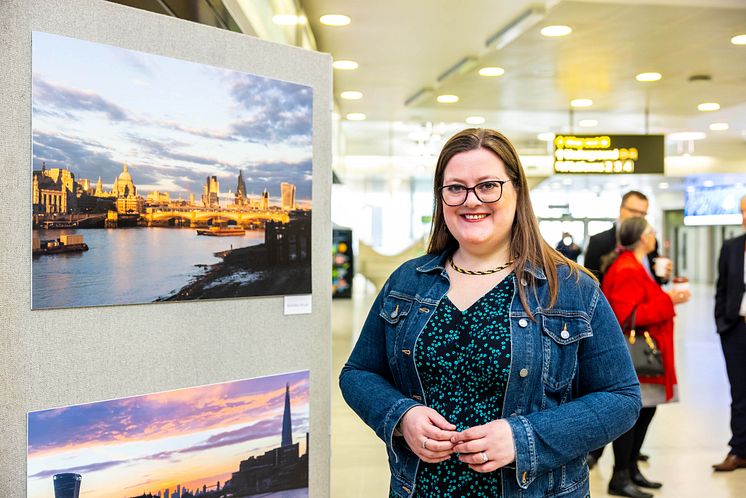 Barbara Hough unveils her photograph of London Blackfriars train station, which has been selected as the winner of a passenger photo competition by Thameslink to celebrate the 10th anniversary of the station’s reconstruction. The station is the world's largest solar bridge with 4,400 panels across its roof, generating half of the station's electricity. Photo credit should read: Ciaran McCrickard/PA