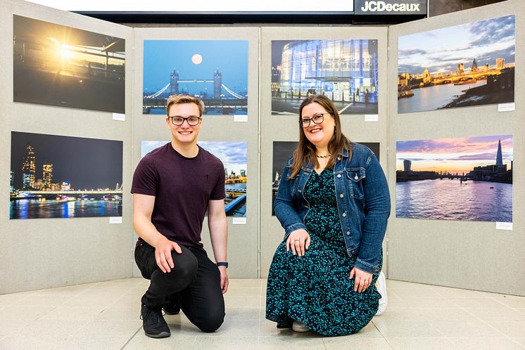 Barbara Hough and Will Russell unveil their photographs (top right and bottom left respectively) of London Blackfriars train station, as part of a passenger photo competition by Thameslink to celebrate the 10th anniversary of the station’s reconstruction. The station is the world's largest solar bridge with 4,400 panels across its roof, generating half of the station's electricity. Photo credit should read: Ciaran McCrickard/PA