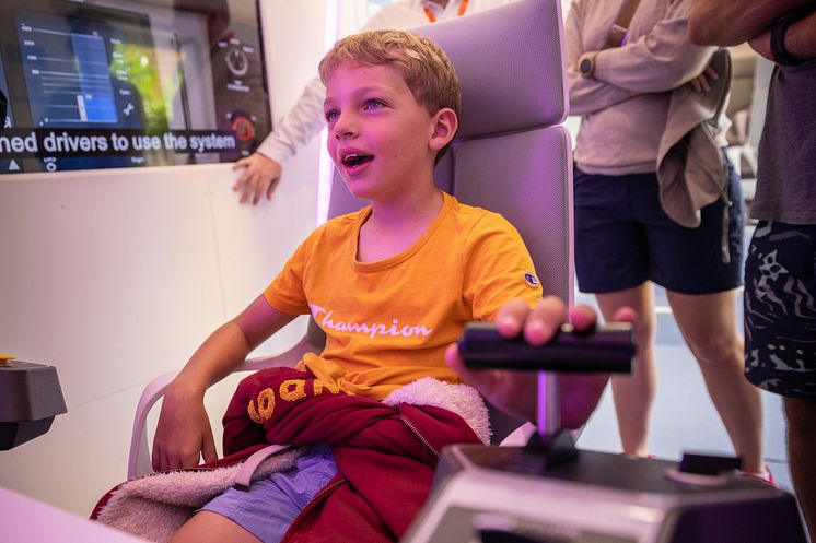 In the driving seat: Jasper Berry, aged 8, 'drives' a train on board Southern and Thameslink's mobile simulator which is visiting the Bluebell Railway for Railway 200