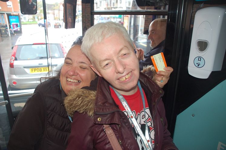 Buddies together - Mellie (Travel Buddy Project Assistant), left, with Nat board the bus as part of the session with Grace Eyre