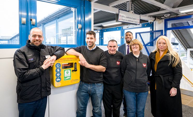 Tom Moran (far left), MD of Thameslink and Great Northern, announces the installation of life-saving defibrillators across the Govia Thameslink Railway network with (from left, front) paramedic James Keightley, David and Arline Hursey of DiPPs, Kim Lloyd of London Hearts and (behind) Welwyn Garden City station manager Dwayne Johnson