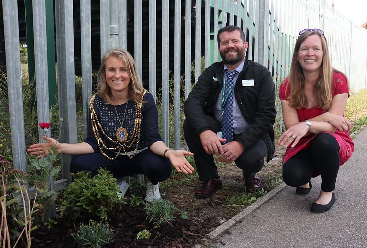 L-R Brighton and Hove Mayor Alexandra Phillips, Falmer Station Manager Andy Gardner and Catherine Simmons, of Sussex Community Rail Partnership, admire the new plants