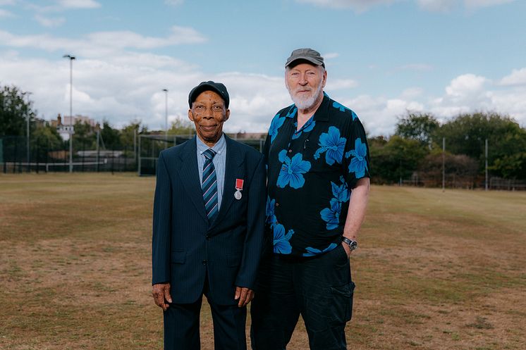 Siggy Cragwell, Thameslink's oldest employee, and folk legend Richard Thompson at Siggy's cricket ground
