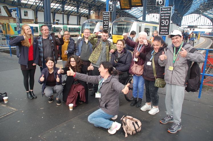 Thumbs up to integrated journeys on public transport: Accessibility managers Victoria Garcia of Brighton & Hove Buses (kneeling, left) and Carl Martin of Govia Thameslink Railway (in wheelchair) joined Grace Eyre Travel Buddy Manager (Team Leader) Claire Hudson (kneeling next to Victoria) joined forces to help train a group of Sussex residents with learning disabilities how to travel independently
