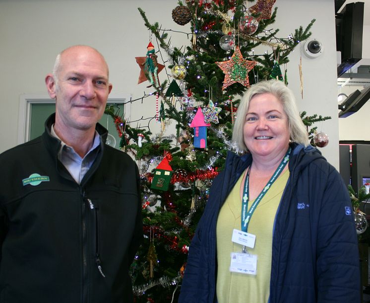 Ticket Office Clerk Ian Parsons, who dressed the tree with decorations made by QE II Silver Jubilee schoolchildren, and Horsham Station Manager Sue Litterick.