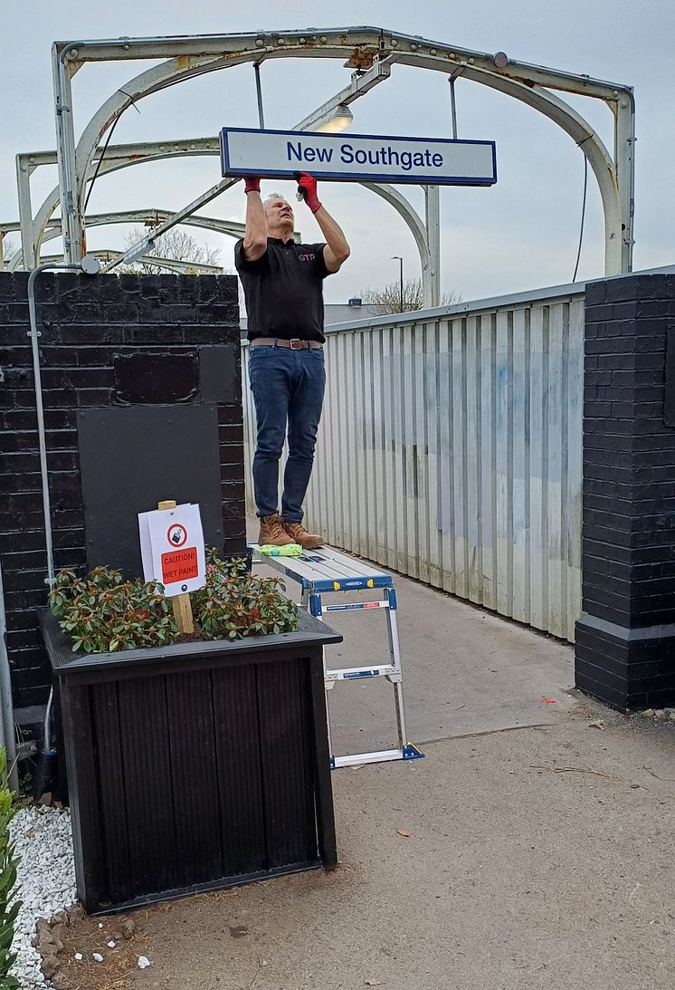 Infrastructure Director Keith Jipps works on New Southgate's station sign.jpg