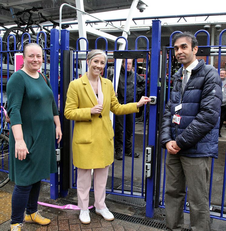 Key fob required: Daisy Cooper MP (centre) with Station Manager Harsitt Chandak and Cllr Jacqui Taylor at St Albans new cycle hub