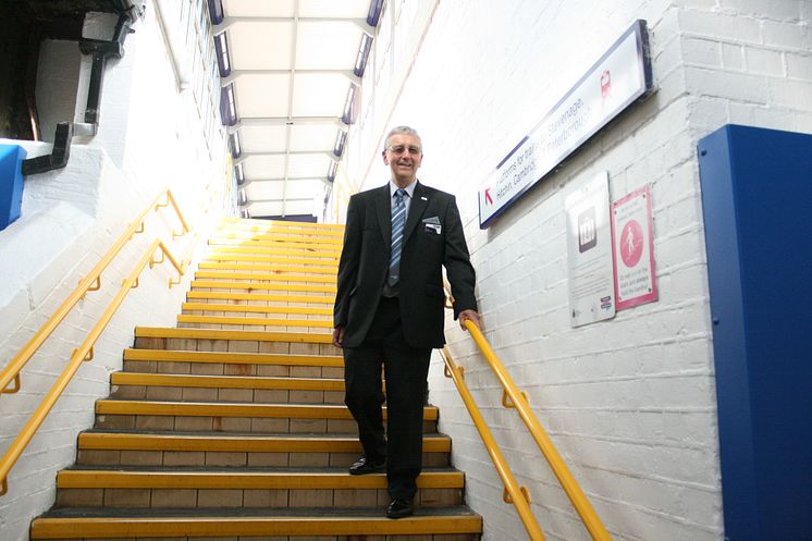 Knebworth station Sales Assistant John Richardson tests out the new handrail