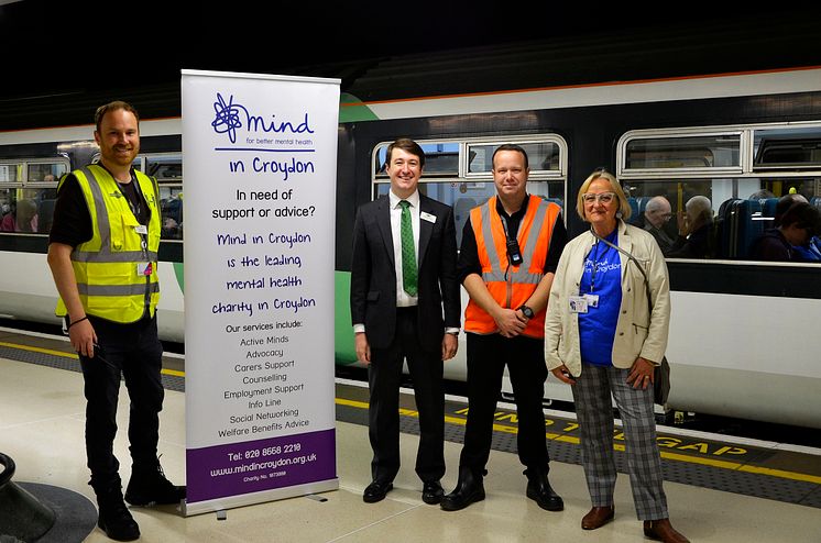 About to board the final Class 455 run from Victoria: (l to r) Southern's Head of Network Operations Phil Nacmanson, Customer Services Director Chris Fowler and Network Operations Manager Antony Yandell with Cara Cooper of Croydon MIND