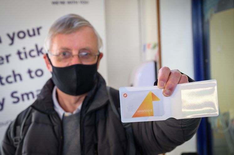 Neil Middleton, of Rail Future Hertfordshire and Bedfordshire, is issued with a free key smartcard at Hitchin station 2
