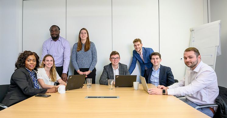 Pictured left to right: Belinda Vieira (GTR grad), Maeve Macdonald (NR grad), Simeon Jonjo (GTR grad), Lucy Lawrence (NR grad), Oliver Grant (NR grad), Alex Haigh (GTR grad), Sam Gibbins (NR grad) and Alex Kerr (GTR grad)