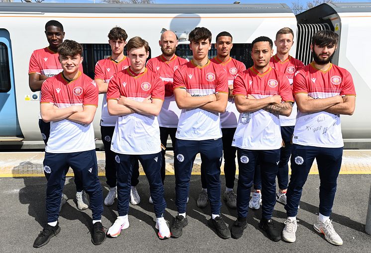 Pictured l-r: Stevenage FC Academy and First Team players Jadon Ogwuazor, Jake Watkiss, Freddie Stanley, Harry Giroud, Scott Cuthbert, Owen Cochrane, Luther James-Wildin, Elliott List, Luke Norris and Theo Alexandrou