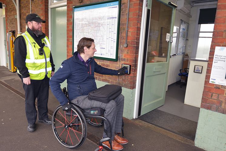GTR Accessibility Lead Carl Martin visits the new Three Bridges customer information point with Accessibility Ambassador Steven Pejda