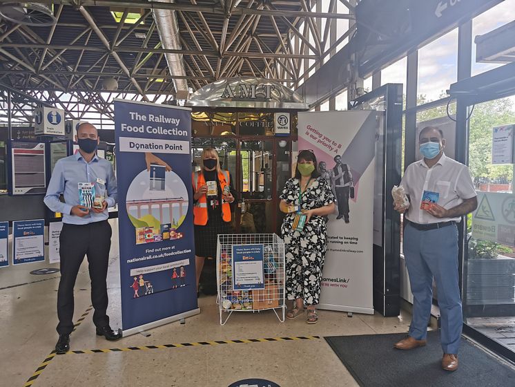 Left to right: Tom Moran, Managing Director for Thameslink and Great Northern, Bernie Lee station manager, Sarah Broughton Project Manager at the Bedford Foodbank and Mohammad Yasin MP for Bedford