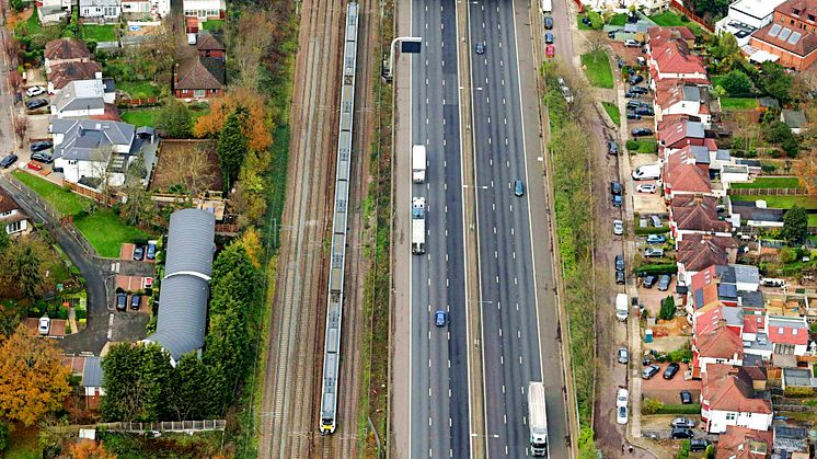 • Aerial view of the Midland main line beside the M1 - Credit_ Network Rail Air Operations