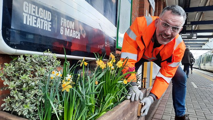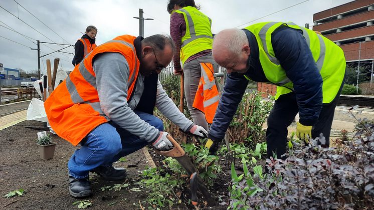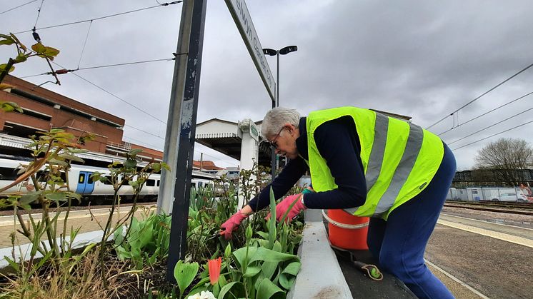 A volunteer tidies up one of the station's flower beds