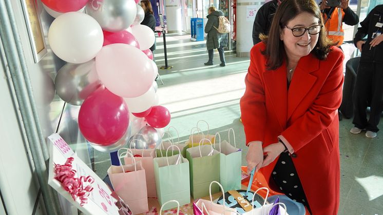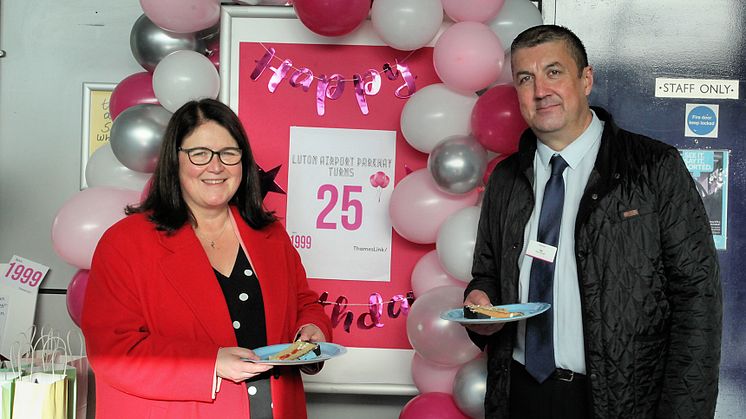From left: MP for Luton South and South Bedfordshire, Rachel Hopkins, and Luton Airport Parkway station manager, Joe Healy, celebrate the station's 25th anniversary