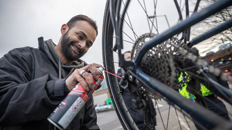 Mechanic Ethan Masih servicing a bike