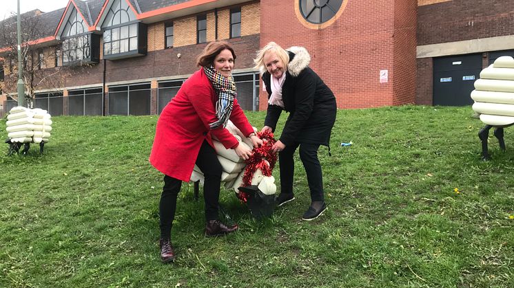 Tinsel and a Santa's hat now festoon the colourful cow, while Christmas lights adorn the large 'Cricklewood' sign, all of were designed and installed by local artist Alistair Lambert. There are even two living Christmas trees and more tinsel around Alistair's sheep who 'graze' in Cricklewood Lane nearby (see pictures below).