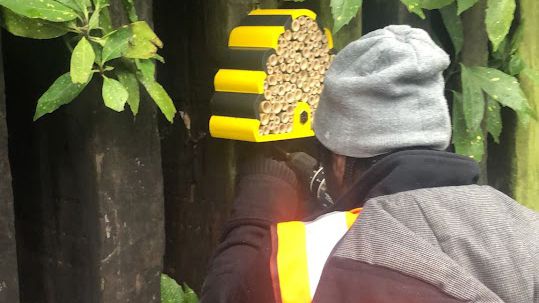 Each site has two types of bird boxes, iconic striped bee hotels for solitary insects, and hibernacula – shelters filled with timber and wood to give small animals and bugs a place to live.