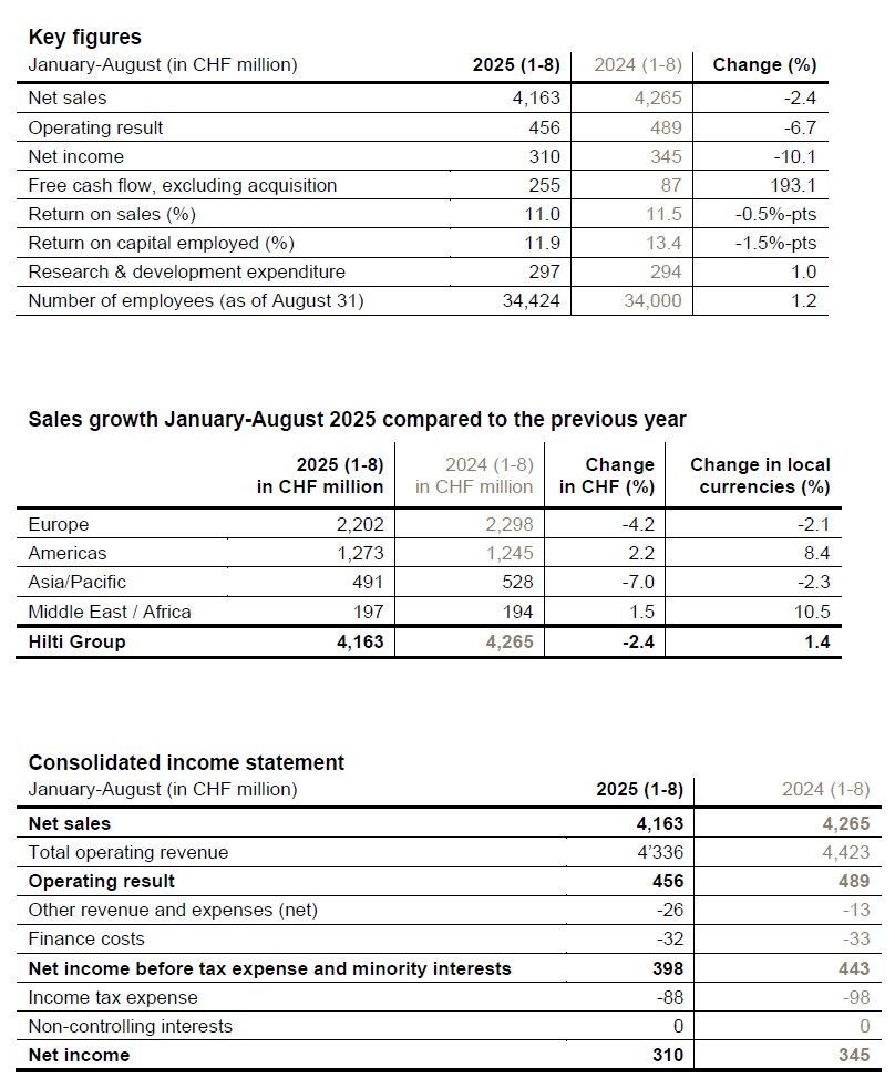 Schaan (FL), September 25, 2025 – The Hilti Group reported sales growth of 1.4 percent in local currencies over the first eight months of 2025. Negative currency effects led to a 2.4 percent decrease in sales to CHF 4163 million.