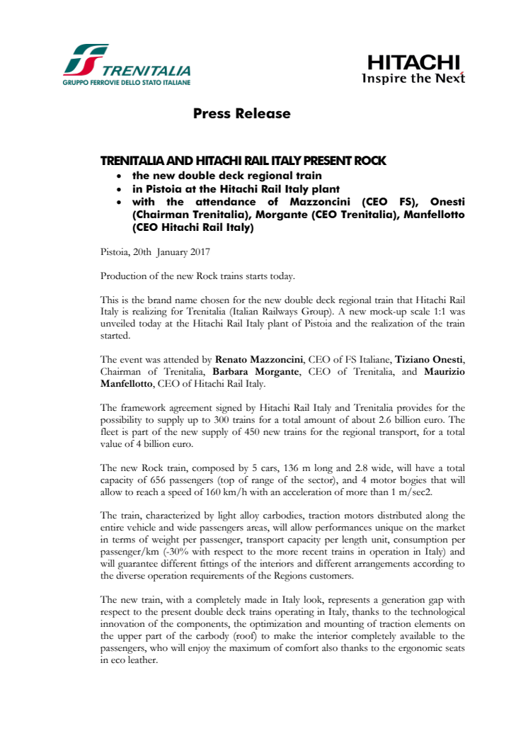 This is the brand name chosen for the new double deck regional train Hitachi Rail Italy is building for Trenitalia. A mock-up scale 1:1 was unveiled at the Hitachi Rail Italy plant of Pistoia and the construction of the train started.