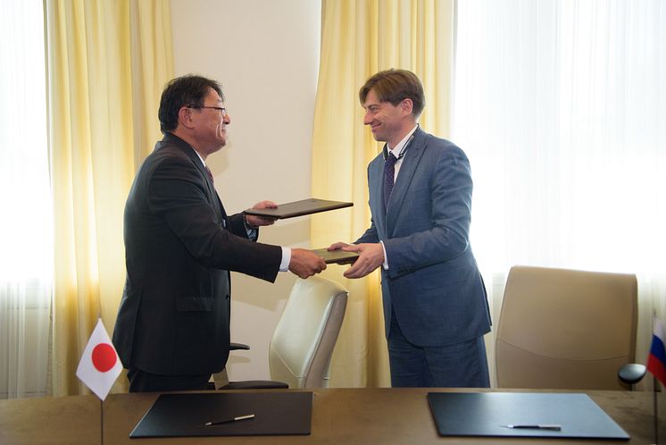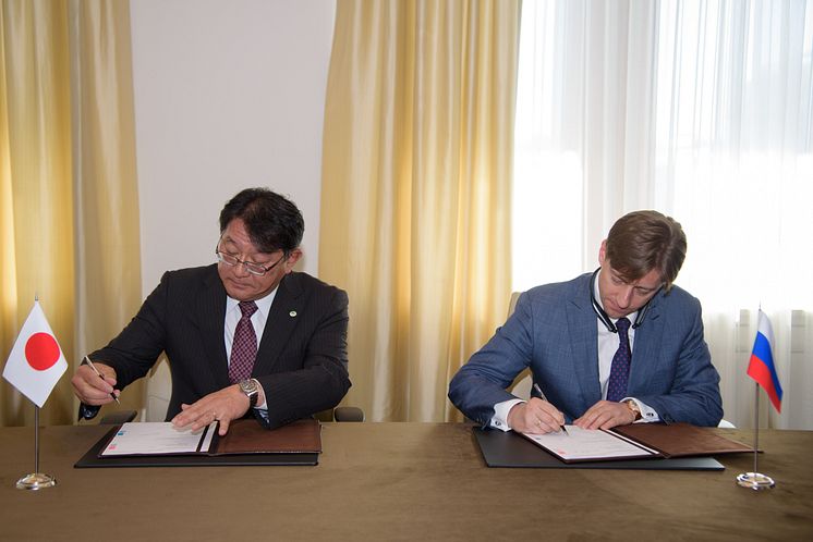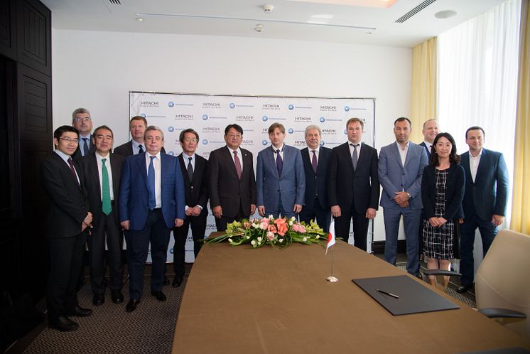 Kirill Lipa, CEO of Transmashholding, and Kiyoshi Nakata, Deputy COO Rolling Stock of Railway Systems Business Unit, Hitachi sign a Joint Venture agreement