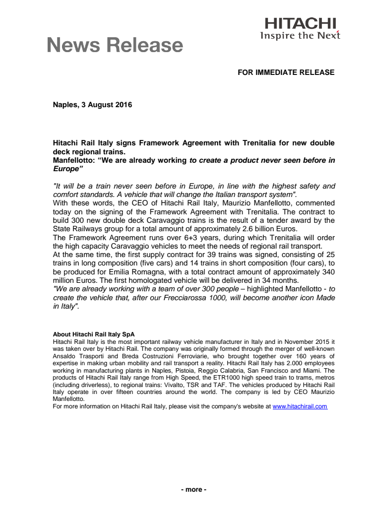 "It will be a train never seen before in Europe, in line with the highest safety and comfort standards. A vehicle that will change the Italian transport system". With these words, the CEO of Hitachi Rail Italy, Maurizio Manfellotto, commented today on the signing of the Framework Agreement with Trenitalia. The contract to build 300 new double deck Caravaggio trains is the result of a tender award by the State Railways group for a total amount of approximately 2.6 billion Euros.