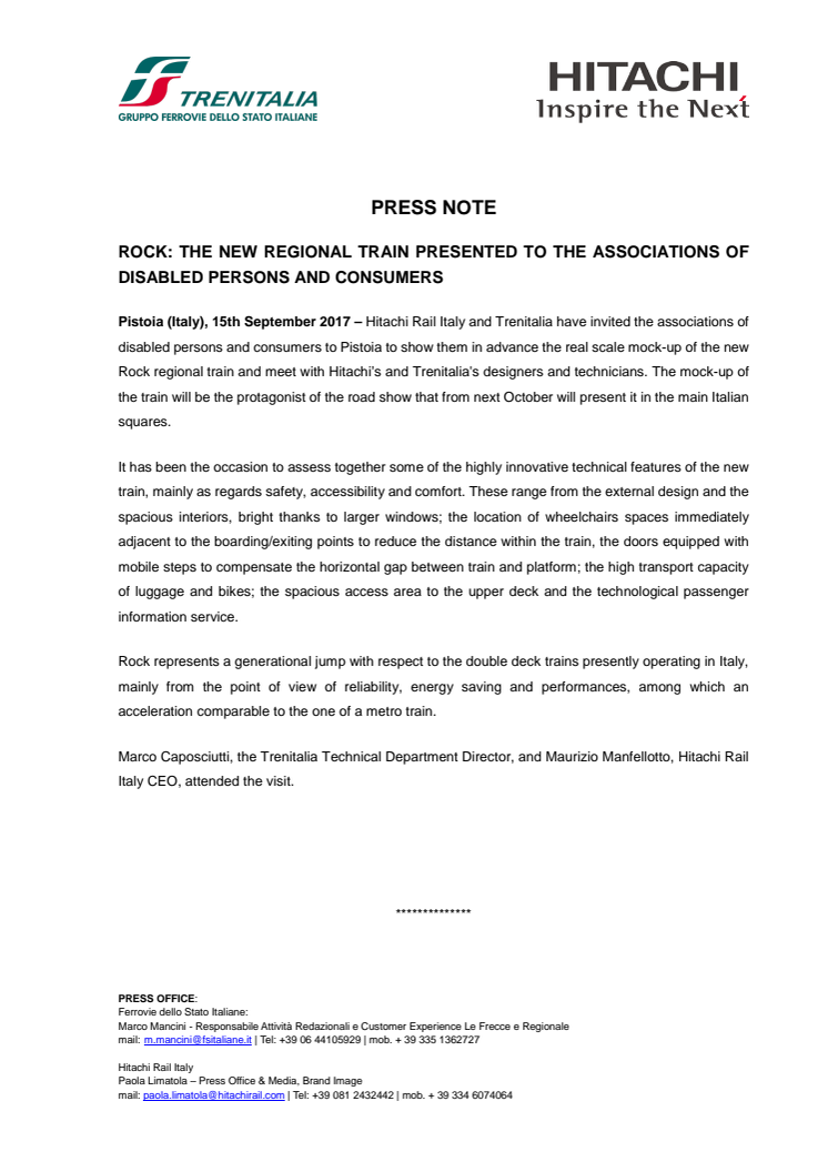 Hitachi Rail Italy and Trenitalia have invited the associations of disabled persons and consumers to Pistoia to show them in advance the real scale mock-up of the new Rock regional train and meet with Hitachi’s and Trenitalia's designers and technicians. The mock-up of the train will be the protagonist of the road show that from next October will present it in the main Italian squares.