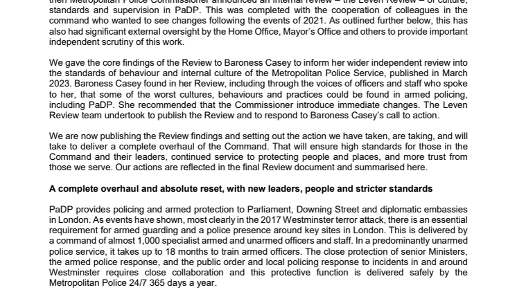 - A wide-ranging review of culture at the Parliamentary and Diplomatic Protection Command, including an overhaul of leadership and supervision, has been completed.