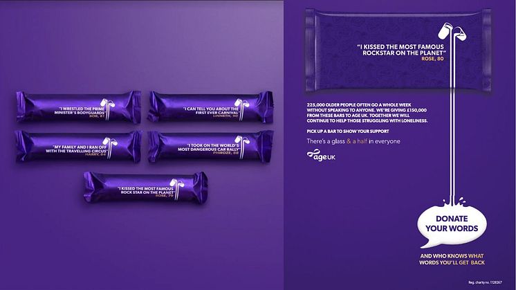 Pippa Rodgers, Brand Manager at Mondelez, says: “We’re proud to continueour long-term partnership with Age UK. To be featuring the Donate yourWords campaign across 10 million Cadbury Dairy Milk bars is both excitingand fitting, as we look for more impactful ways to support this importantmission.
