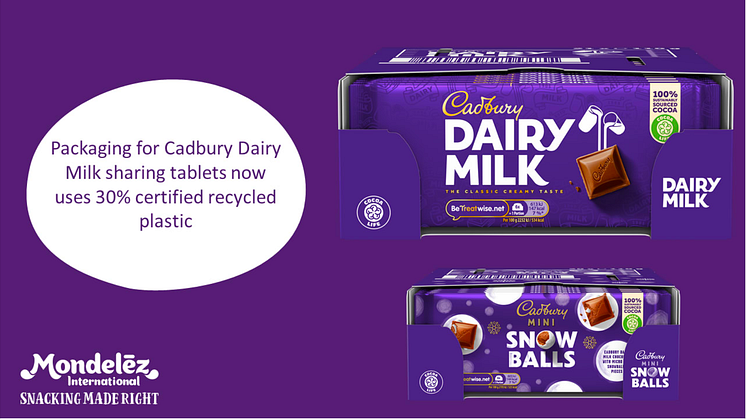- The company’s iconic Cadbury Dairy Milk and Cadbury MiniSnowballs 110g sharing bars made in Bournville now includes30% certified recycled plastic within its packaging.