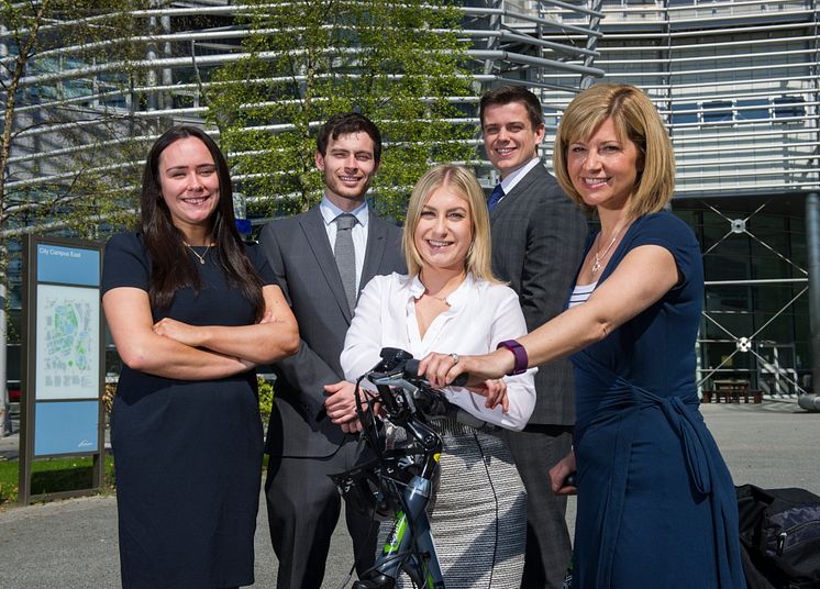 NBS Business Clinic students Aine Connolly, George Allen, Emma Stephenson and William Cooke with Jill Hopkirk from The Cycle Hub.