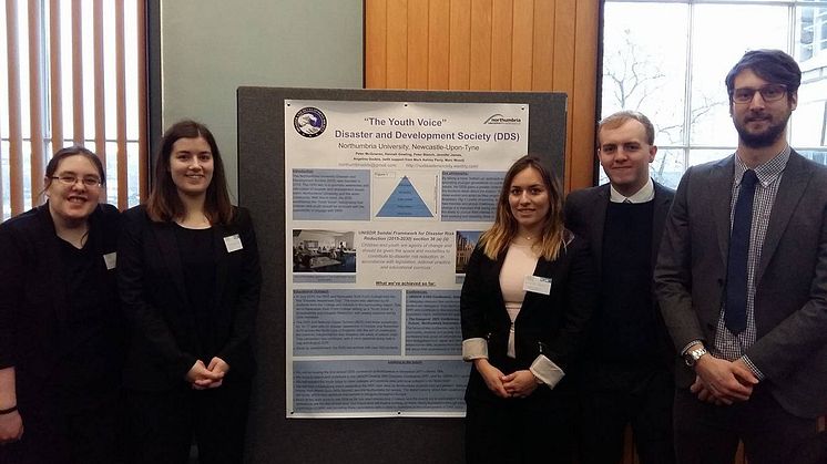 Northumbria’s Disaster Development Society, comprised of students enrolled on the University’s MSc Disaster Management and Sustainable Development degree, helped represent the views of young people on Disaster Risk Reduction. Vice-President Peter McGowran, Secretary Hannah Gowling, events coordinator Peter Blanch, and society members Angelina Gudzio and Jennifer James, all attended the conference in London.