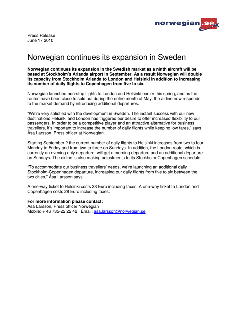 Norwegian continues its expansion in the Swedish market as a ninth aircraft will be based at Stockholm’s Arlanda airport in September. As a result Norwegian will double its capacity from Stockholm Arlanda to London and Helsinki in addition to increasing its number of daily flights to Copenhagen from five to six.