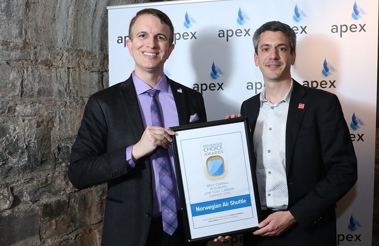 Philip Allport, Norwegian Director of Communications UK and Ireland, accepts the award APEX award from Joe Leader, CEO of APEX