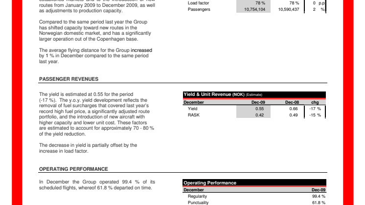 The yield is estimated at 0.55 NOK for December, down 17 per cent compared to the same month in 2008. The development partially reflects the removal of fuel surcharges that covered last year’s fuel price, a significantly adjusted route portfolio, and the introduction of new aircraft with higher capacity and lower unit cost.