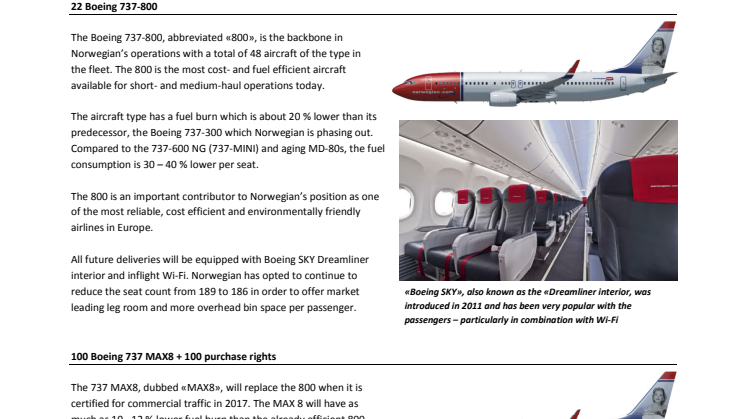Following this transaction Norwegian has a total of 150 purchase rights and 277 aircraft for future delivery, including 55 previously ordered Boeing 737-800. In addition Norwegian has a firm order of 6 787-8 Dreamliners.