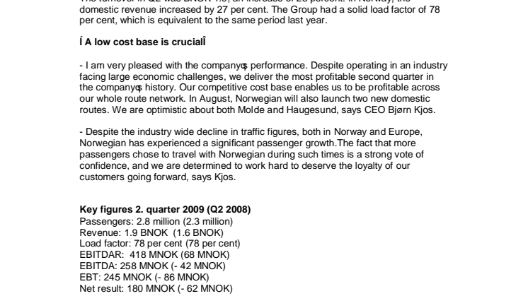 - I am very pleased with the company's performance. Despite operating in an industry facing large economic challenges, we deliver the most profitable second quarter in the company's history. Our competitive cost base enables us to be profitable across our whole route network. In August, Norwegian will also launch two new domestic routes. We are optimistic about both Molde and Haugesund, says CEO Bjørn Kjos.