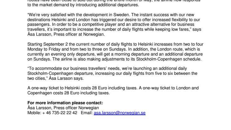 “We’re very satisfied with the development in Sweden. The instant success with our new destinations Helsinki and London has triggered our desire to offer increased flexibility to our passengers. In order to be a competitive player and an attractive alternative for business travellers, it’s important to increase the number of daily flights while keeping low fares,” says Åsa Larsson, Press officer at Norwegian.