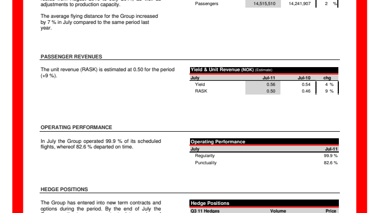 As many as 1,596,298 passengers travelled with Norwegian in June - the highest number of passengers the company has ever recorded during a single month. The company had a 30 percent RPK increase compared to the same month previous year. The unit revenue (RASK) improved by 9 percent compared to July 2010. The load factor was 89.2 percent, up 4 percentage points.