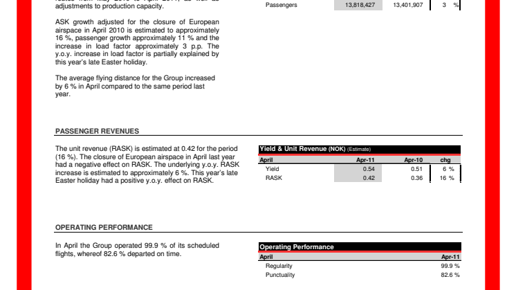 The total number of passengers flown in April 2011 was 1,207,891 compared to 791,371 last year, an increase of 416,520 passengers (53 %).