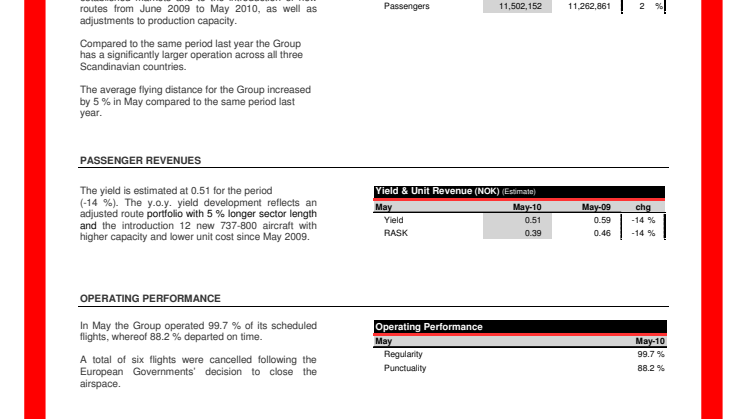 The total number of passengers flown in May 2010 was 1,185,373 compared to 946,082 last year, an increase of 239,291 passengers (25 %).